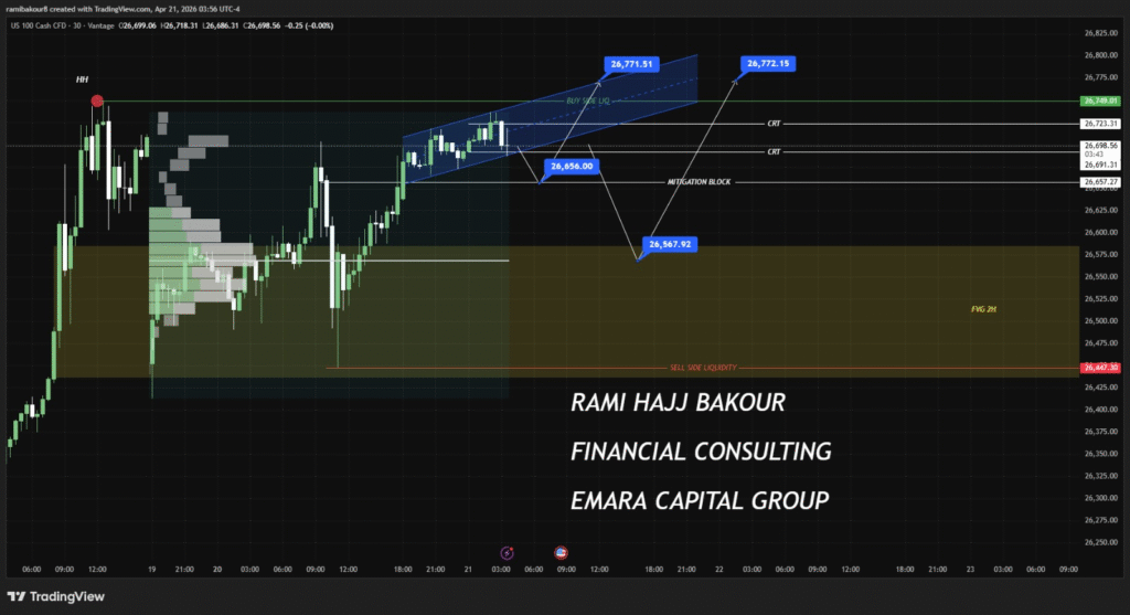 في حال الثبات داخل القناة الصاعدة → استهداف 26,770 – 26,772 وسحب السيولة من الأعلى.
