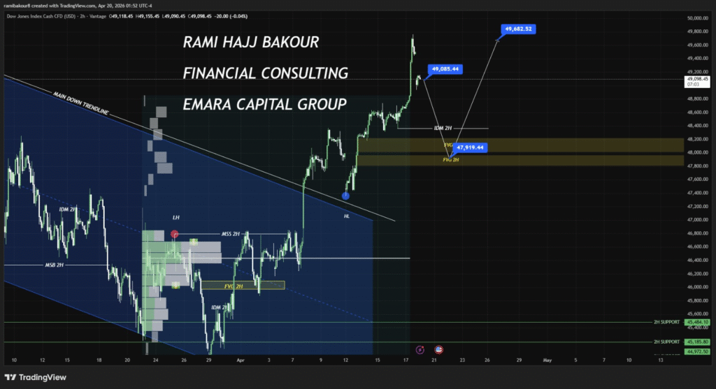 مؤشر الداو جونز نجح في كسر الاتجاه الهابط الرئيسي والخروج من القناة الهابطة، مع تكوين قاع صاعد (HL) أعطى إشارة واضحة على بداية تحول إيجابي في الاتجاه.
